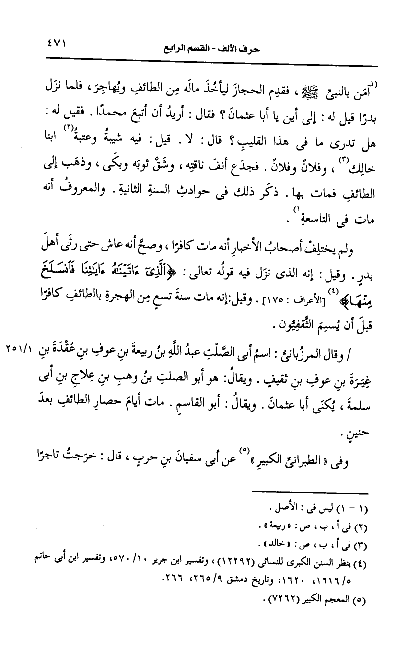 ولم يختلف أصحاب الأخبار أنه مات كافرا وصح أنه عاش حتى رثى أهل بدر وقيل أنه الذي نزل فيه قوله تعالى {الذي آتيناه آياتنا فانسلخ منها} وقيل إنه مات سنة تسع من الهجرة بالطائف كافرا قبل أن يسلم الثَّقفيون.