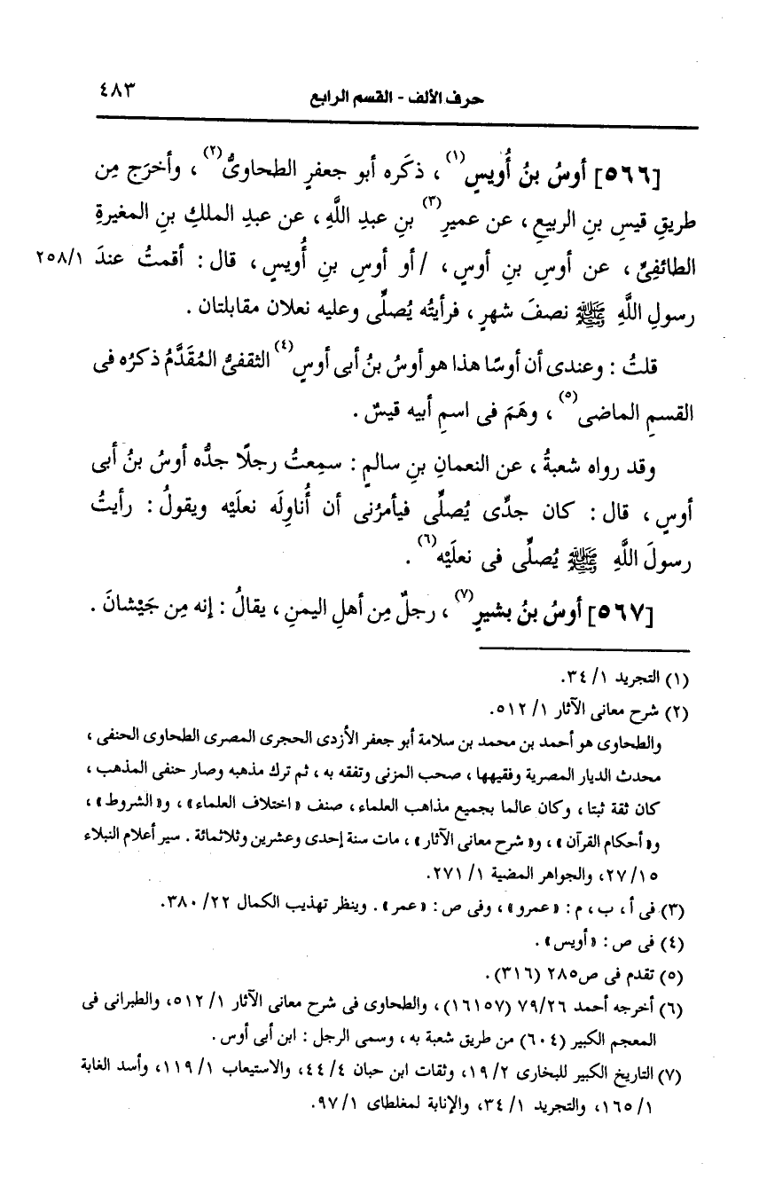 قلت: وعندي أن أوسا هذا هو أوس بن أبي أوس الثَّقفي المتقدم ذكره في القسم الماضي وهم في اسم أَبيه قيس وقد رواه شعبة، عَن النعمان بن سالم سمعت رجلا جده أوس بن أبي أوس، قال: كان جدي يصلي فيأمرني أن اناوله نعليه ويقول رأيت رسول الله صَلى الله عَلَيه وسَلم يصلي في نعليه.