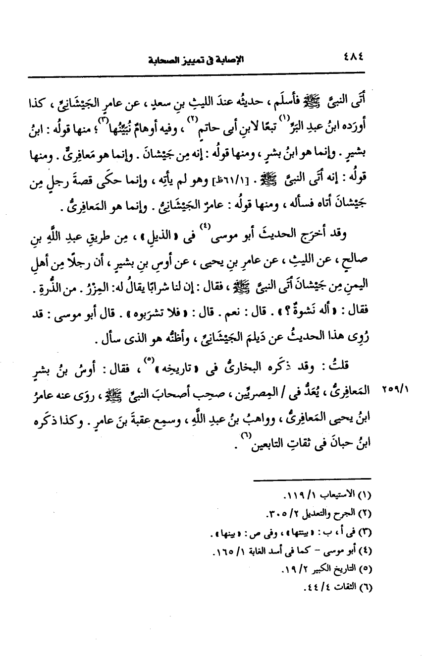 أتى النَّبيّ صَلى الله عَلَيه وسَلم فأسلم وحديثه عند الليث ابن سَعد، عَن عامر الجيشاني كذا أورده ابن عَبد البَرِّ تبعا لابن أبي حاتم وفيه أوهام نبينها منها قوله بن بشير وإنما، هو ابن بشر ومنها قوله إنه من جيشان وإنما هو معافري ومنها قوله إنه أتى النَّبيّ صَلى الله عَلَيه وسَلم وهو لم يأته وإنما حكى قصة رجل من جيشان أتاه فسأله ومنها قوله عامر الجيشاني وإنما هو المعافري.