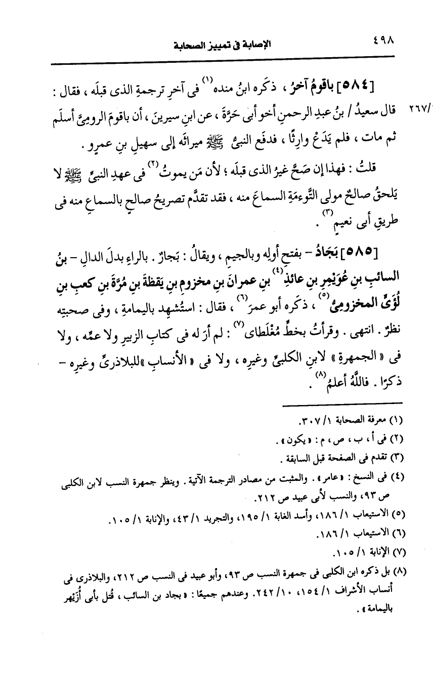 585- بجاد بفتح أوله والجيم، ويُقال: بجار بالراء بدل الدال بن السائب بن عويمر بن عامر بن عمران بن مخزوم بن يقظة بن مرة بن كعب بن لؤي المخزومي.