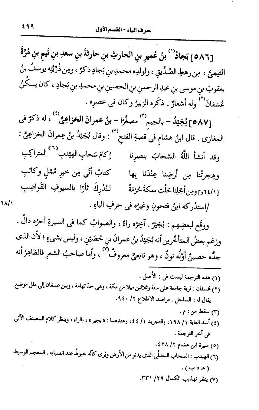 586- (ز) بجاد بن عمير بن الحارث بن حارثة ابن سَعد بن تيم بن مرة التيمي من رهط الصديق. ولولده محمد بن بجاد ذكر ومن ذريته يوسف بن يعقوب بن موسى بن عبد الرحمن بن الحصين بن محمد بن بجاد كان يسكن عسفان وله اشعار.