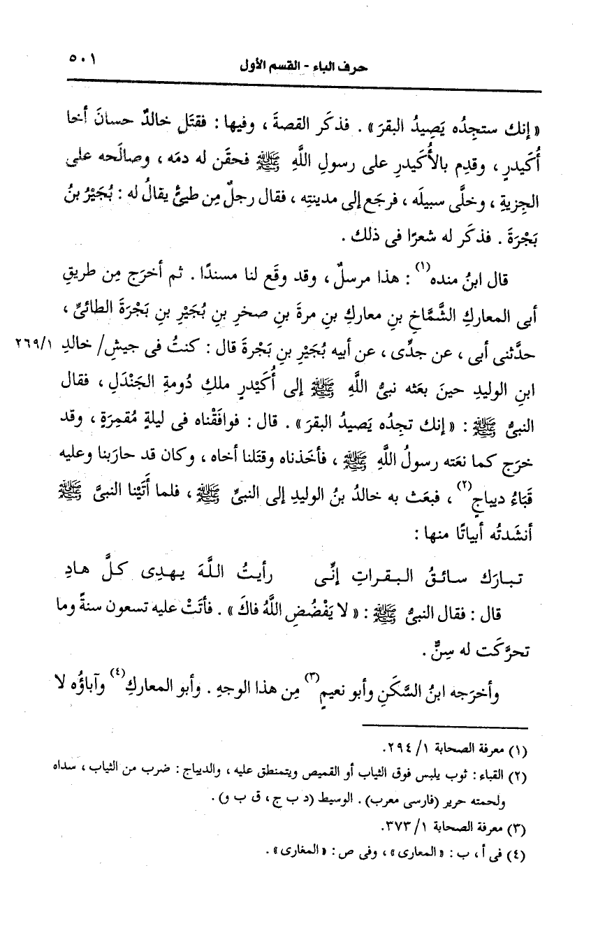 ثم أخرج من طريق أبي المعارك الشماخ بن معارك بن مرة بن صخر بن بجير بن بجرة الطائي حدثني أبي، عَن جدي، عَن أَبيه بجير بن بجرة قال كنت في جيش خالد بن الوليد حين بعثه نبي الله صَلى الله عَلَيه وسَلم إلى أكيدر ملك دومة الجندل فقال النَّبيّ صَلى الله عَلَيه وسَلم انك ستجده يصيد البقر قال فوافقناه في ليلة مقمرة وقد خرج كما نعته رسول الله صَلى الله عَلَيه وسَلم فأخذناه وقتلنا أخاه، وكان قد حاربنا وعليه قباء ديباج فبعث به خالد بن الوليد إِلَى النَّبِيِّ صَلى الله عَلَيه وسَلم فلما أتينا النَّبيّ صَلى الله عَلَيه وسَلم انشدته أبياتا منها:
