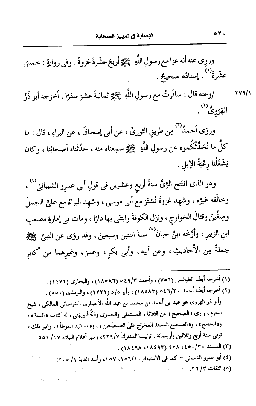 وروى أَحمد من طريق الثوري، عَن ابن إسحاق، عَن البراء قال ما كل مانحدثكموه، عَن رسول الله صَلى الله عَلَيه وسَلم سمعناه منه حدثناه أصحابنا، وكان يشغلنا رعية الإبل.