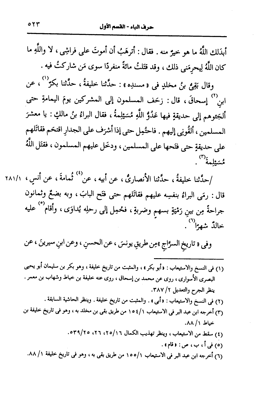 وقال بقي بن مخلد في مسنده، حَدَّثنا خليفة، حَدَّثنا أَبو بكر، عَن أبي إسحاق قال زحف المسلمون إلى المشركين يوم اليمامة حتى ألجئوهم إلى حديقة فيها عدو الله مسيلمة فقال البراء بن مالك يا معشر المسلمين ألقوني إليهم فاحتمل حتى إذا أشرف على الجدار اقتحم فقاتلهم على حديقة حتى فتحها المسلمين ودخل عليهم المسلمين فقتل الله مسيلمة.