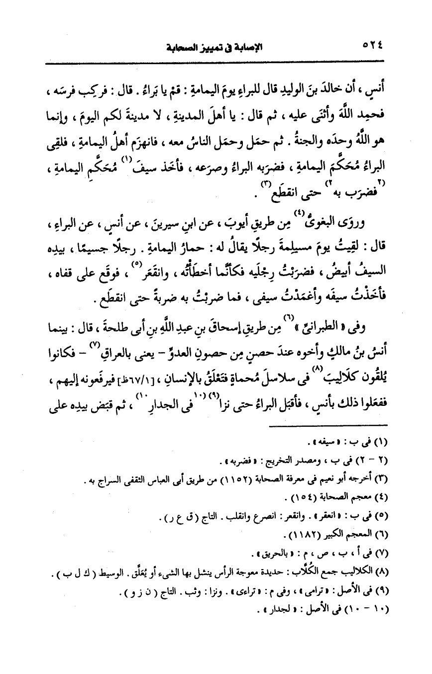 وروى البَغَوِي من طريق أيوب، عَن ابن سيرين، عَن أنس، عَن البراء قال لقيت يوم مسيلمة رجلا يُقَالُ لَهُ: حمار اليمامة رجلا جسيما بيده السيف أبيض فضربت رجليه فكأنما أخطأته وانقعر فوقع على قفاه فأخذت سيفه واغمدت سيفي فما ضربت به ضربة حتى انقطع.