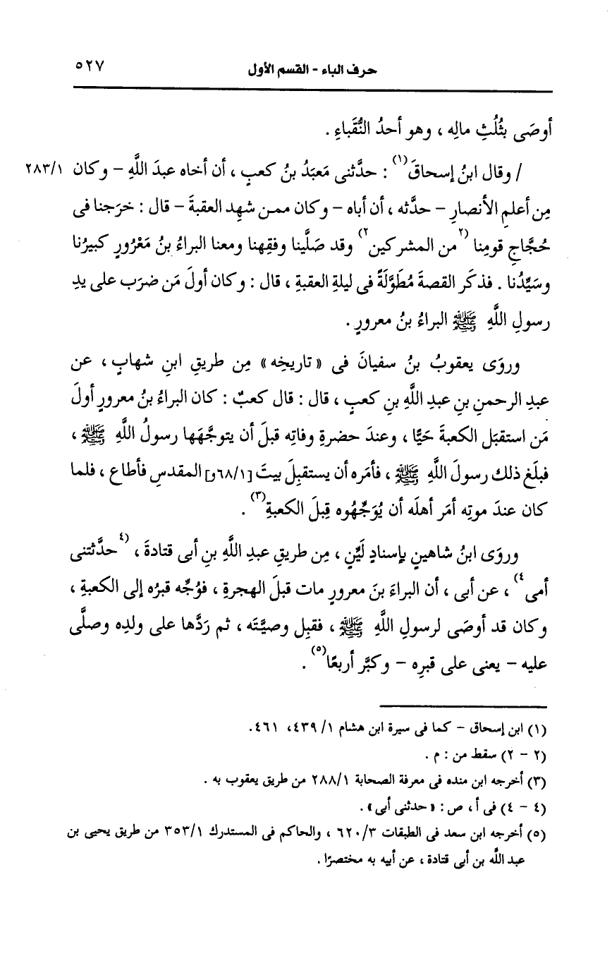 وروى يعقوب بن سفيان، في "تاريخه" من طريق ابن شهاب، عَن عبد الرحمن بن عَبد الله بن كعب قال قال كعب كان البراء بن معرور أول من استقبل الكعبة حيا وعند حضرة وفاته قبل أن يتوجهها رسول الله صَلى الله عَلَيه وسَلم فبلغ ذلك رسول الله صَلى الله عَلَيه وسَلم فأمره أن يستقبل بيت المقدس فأطاع فلما كان عند موته أمر أهله أن يوجهوه قبل الكعبة.