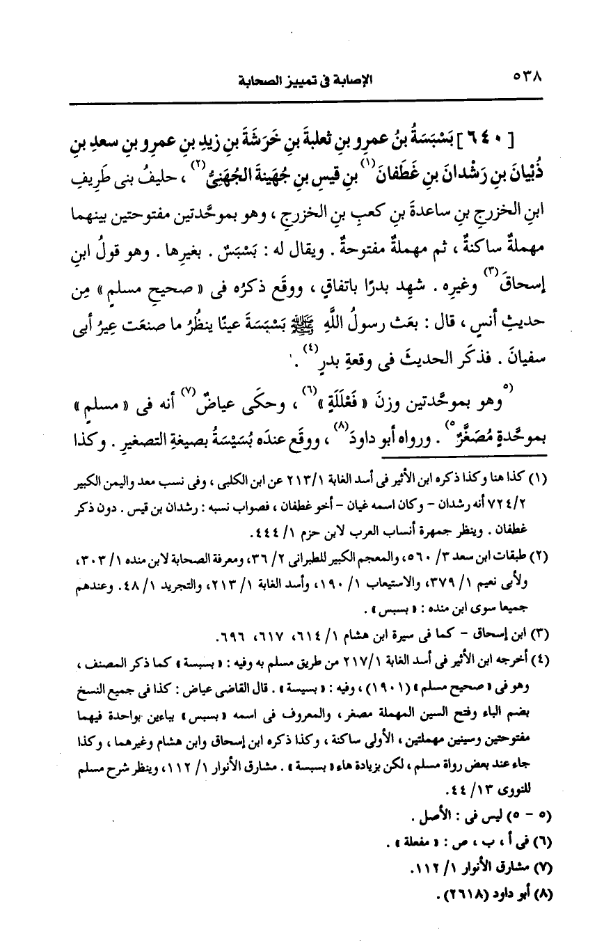 شَهِدَ بَدْرًا باتفاق ووقع ذكره في صحيح مسلم من حديث أنس قال بعث رسول الله صَلى الله عَلَيه وسَلم بسبسة عينا ينظر ما صنعت غير أبي سفيان فذكر الحديث في وقعة بدر وهو بموحدتين وزن فعللة.