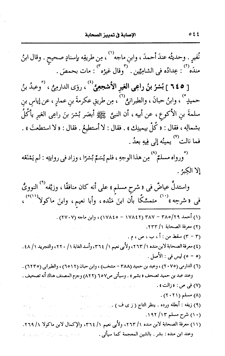 وقد قيل فيه بشر بالمعجمة وبذلك ذَكَرَهُ ابن مَنْدَه وأنكر عليه أَبو نعيم ونسبه إلى التصحيف ولم يحك الدارقطني، وابن ماكولا فيه خلافا أنه بالمهملة وأما البيهقي فحكى في السُّنَن أنه بالمعجمة أصح وأغرب ابن فتحون فاستدركه فيمن اسمه بشير كما سيأتي.