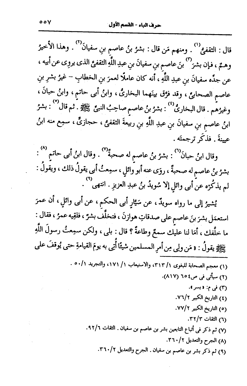 يشير إلى ما رواه سويد، عَن سيار أبي الحكم، عَن أبي وائل أن عمر استعمل بشر بن عاصم على صدقات هوازن فتخلف بشر فلقيه عمر فقال ما خلفك أما لنا عليك سمع وطاعة قال بلى ولكن سمعت رسول الله صَلى الله عَلَيه وسَلم يقول من ولي من أمر المسلمين شيئا أتى به يوم القيامة حتى يوقف على جسر جهنم الحديث.