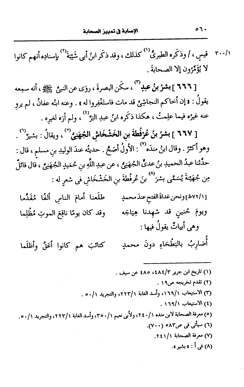 وقال ابن مَنْدَه: الأول أصح. حديثه عند الوليد بن مسلم، قال: حَدَّثنا عبد الحميد بن عَدِيّ الجهني، عَن عَبد الله بن حميد الجهني قال قائل من جهينة يسمى بشر بن عرفطة بن الخشخاش في شعر له: