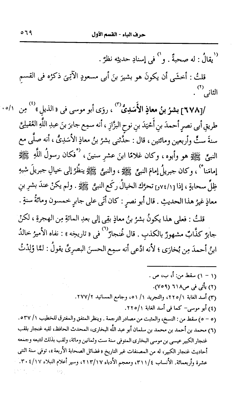 678- بشر بن معاذ الأسدي روى أَبو موسى في الذيل من طريق أبي نصر أَحمد بن احيد بن نوح البزاز أنه سمع جابر بن عَبد الله العقيلي سنة ستة وأربعين ومائتين قال حدثني بشر بن معاذ الأسدي أنه صلى مع النَّبيّ صَلى الله عَلَيه وسَلم هو وأبوه، وكان غلاما بن عشر سنين، وكان جبريل أمام النَّبيّ صَلى الله عَلَيه وسَلم والنبي ينظر إلى خيال جبريل شبة ظل سحابة إذا تحرك الخيال ركع النَّبيّ صَلى الله عَلَيه وسَلم ولم يكن عند بشر بن معاذ غير هذا الحديث.