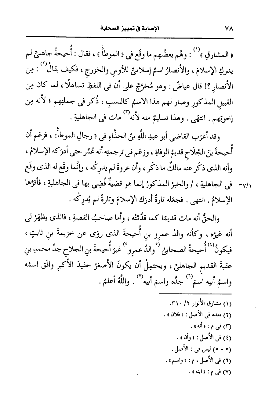 فجعله تارة أدرك الإسلام وتارة لم يدركه والحق أنه مات قديما كما قدمته وأما صاحب القصة فالذي يظهر لي أنه غيره وكأنه والد عَمرو بن أحيحة الذي روى، عَن خزيمة بن ثابت فيكون أحيحة الصحابي والد عَمرو غير أحيحة بن الجلاح جد محمد بن عقبة القديم الجاهلي ويحتمل أن يكون الأصغر حفيد الأكبر وافق اسمه واسم أَبيه واسم جده واسم ابنه والله أعلم.