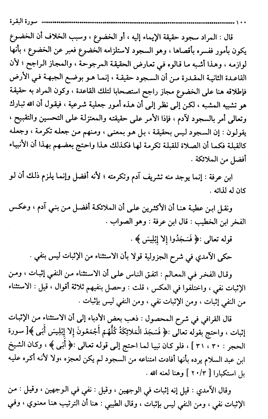 قال: (اختلفوا) هل المراد السجود حقيقة أو الإيماء إليه أو الخضوع؟ وسبب الخلاف أن الخضوع بكون بأمور، ففسره بأقصاها وهو السجود لاستلزامه الخضوع فعبّر عن الخضوع بلوازمه وهذا (يشبه) ما قالوه (في تعارض) الحقيقة المرجوحة والمجاز، لأن القاعدة الثابتة المقررة في أن السجود حقيقة إنما هو بوضع الجبهة في الأرض فإطلاقه (هنا) على الخضوع مجاز راجح استصحابا لتلك القاعدة، وكون المراد به حقيقة هو نسبة المشبه، لكن (إِنْ) نظرنا إلى (أنّ) هذه الأمور جعلية شرعية فنقول: إنّ الله تبارك وتعالى أمر بالسّجود لآدم (فنأخذ) الأمر على حقيقته والمعتزلة على (قاعدة) التحسين والتقبيح يقولون: إن السجود ليس حقيقة بل هو بمعنى الخضوع. ومنهم من جعله تكرمة وجعل آدم كالقبلة فكما أن الصلاة للقبلة تكرمة لها فكذلك هذا، واحتج بعضهم بهذا أن الأنبياء أفضل من الملائكة.