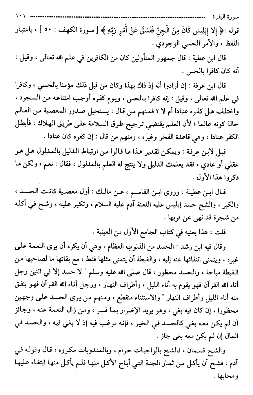 قال ابن عرفة: إن أرادوا أنّه إذ ذاك كفر بهذا الفعل وكان قبل ذلك مؤمنا (بالحسّ) (وكان) كافرا في علم الله تعالى وقيل: إنه كان كافرا بالحس، وشؤم كفره أوجب متناعه من السجود.