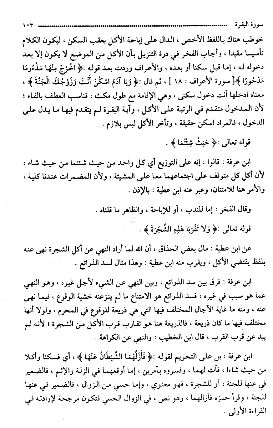 وأجاب الفخر في درة التنزيل: بأن الأكل من الموضع لا يكون إلا بعد دخوله له إما قبل سكناه أو بعده والأعراف وردت بعد قوله: {اخرج مِنْهَا مَذْءُوماً مَّدْحُوراً} (خطابا للشيطان) ثم قال: {وَيَآءَادَمُ اسكن أَنتَ وَزَوْجُكَ الجنة} معناه: ادخلْها أنت دخول سكنى وهي الإقامة مع طول مكث فناسب العطف بالفاء لأن (الدّخول) متقدم في الرتبة على الأكل وآية البقرة لم يتقدم فيها ما يدل على الدخول، فالمراد اسكن حقيقة.