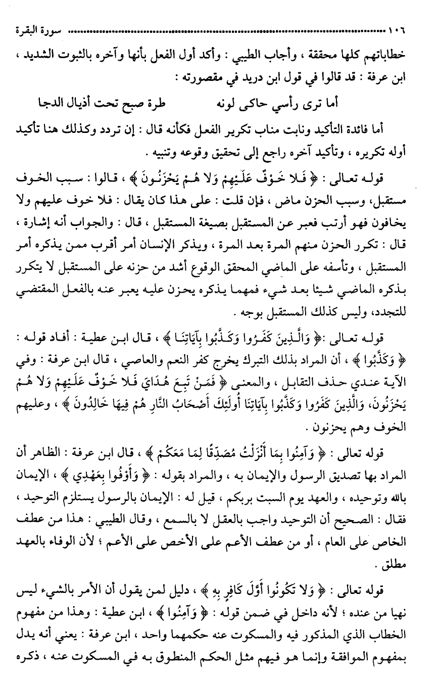 قال ابن عرفة: وفي الآية عندي حذف التقابل والمعنى: فَمَن تَبِعَ هُدَايَ فَأوُلئِكَ أَصْحَابُ الجَنَّةِ هُمْ فِيهَا خَالِدُونَ، وَلاَ خَوْفَ عَلَيهِمْ وَلاَ هُمْ يَحْزَنُونَ (أي لا حزن عليهم) وَالَّذينَ كَفَرُوا وَكَذَّبُوا بِآيَاتِنَا أُوْلئِكَ أَصْحَابُ النَّارِ هُمْ فِيهَا خَالِدُونَ وعليهم الخوف وهم يحزنون.