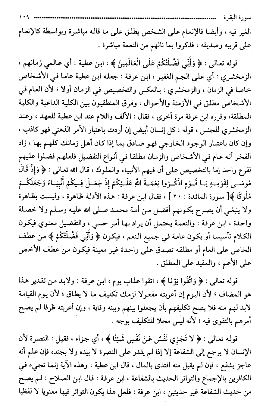 (قرره) ابن عرفة مرة أخرى فقال: الألف (واللام) عند ابن عطية للعهد، وعند الزمخشري للجنس، ونظيره كقولك: كل إنسان أبيض، إن أردت (اعتبار) الأمر الذهني فهو كاذب، وإن (كان) باعتبار الوجود الخارجي فهو صادق إذا كان أهل زمانك كلهم بيضا. زاد الفخر الرازي: أنه عام في الأشخاص والأزمان / مطلق في أنواع التفضيل. فلعلّهم فضّلوا عليهم (لفرع) واحد إما بالتنصيص على أن منهم الأنبياء والملوك قال تعالى {وَإِذْ قَالَ موسى لِقَوْمِهِ يَاقَوْمِ اذكروا نِعْمَةَ الله عَلَيْكُمْ إِذْ جَعَلَ فِيكُمْ أَنبِيَآءَ وَجَعَلَكُم مُّلُوكاً} فقال ابن عرفة: «هذه دلالة ظاهرة (وليست نصا) ولا ينبغي أن يصرح بكونهم أفضل من أمة محمد صَلَّى اللَّهُ عَلَيْهِ وَسَلَّم َ ولا في خصلة واحدة.