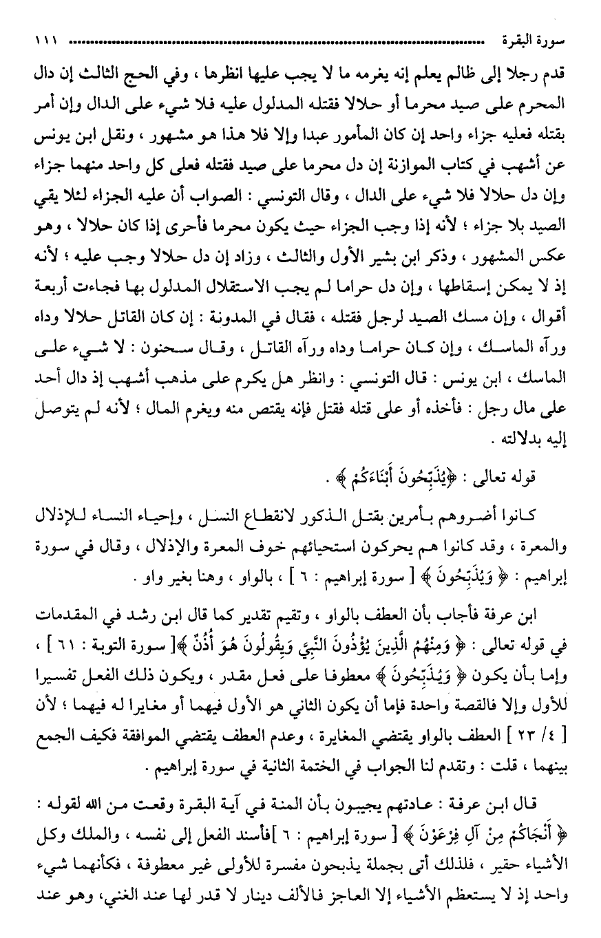 قال ابن عرفة: الجواب (إما) بأن العطف بالواو (تفسير) كما قال الشيخ ابن رشد في المقدمات في قوله تعالى: {وَمِنْهُمُ الذين يُؤْذُونَ النبي وَيِقُولُونَ هُوَ أُذُنٌ} وإما بأن يكون «وَيُذَبِّحُونَ» معطوفا على فعل مقدر يكون ذلك الفعل تفسير الأول، وإلا فالقصة واحدة.