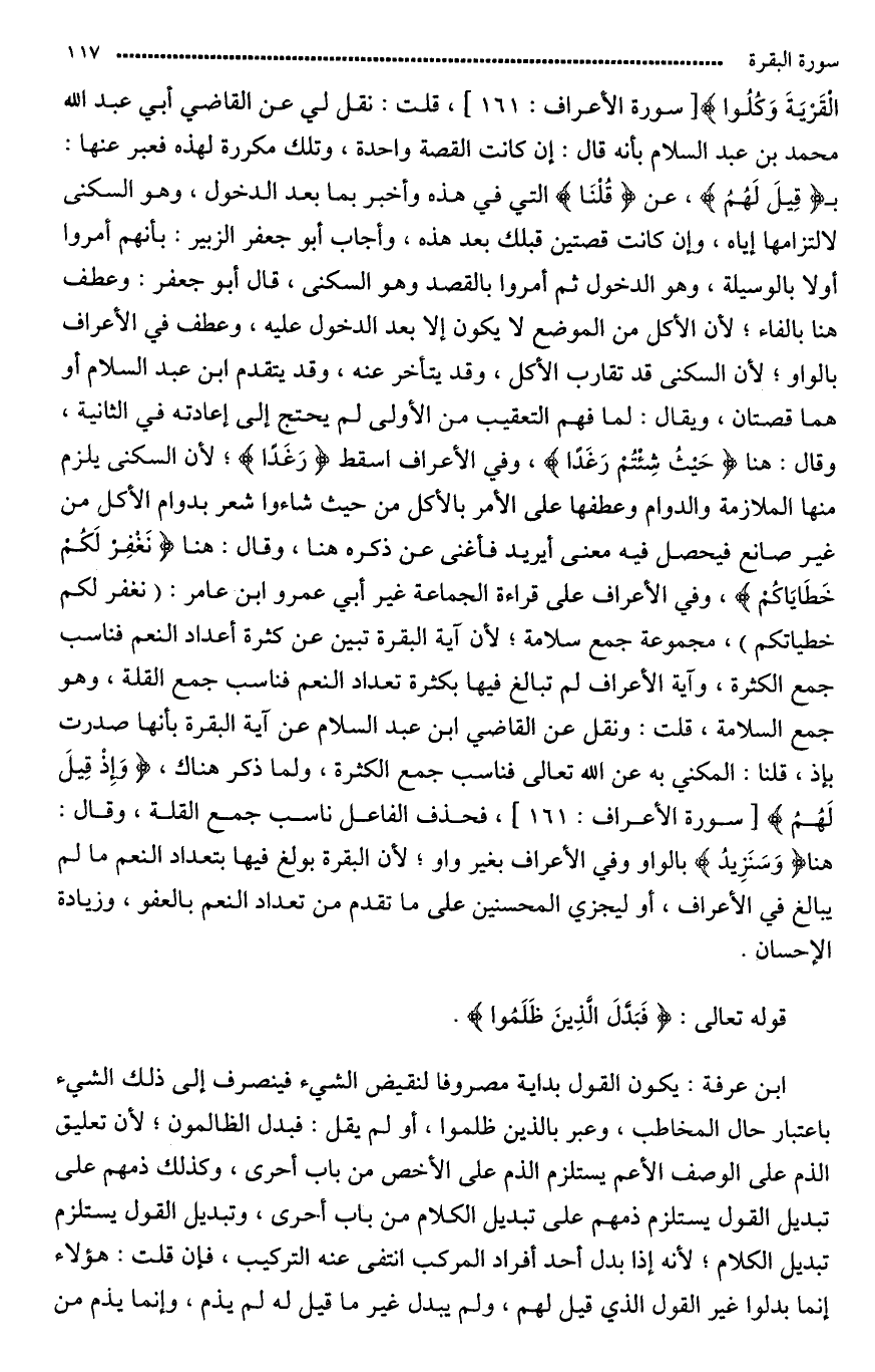 قال ابن عرفة: يكون القول بذاته مصروفا (لنقيض) الشّيء، فينصرف إلى ذلك الشيء باعتبار حال المخاطب، وعَبّر ب «الَّذِينَ ظَلَمُواْ» ولم يقل: فَبَدَّلَ الظالمون، لأن تعليق الذم على الوصف الأعم يستلزم الذم على الأخص من باب أحرى، (وكذلك ذمّهم على) تبديل القول يستلزم (ذمهم) على تبديل الكلام (من باب أحرى) لأنه إذا (بدل) أحد قرار المركب انتفى عنه التركيب. فإن قلت: هؤلاء إنما بدلوا غير القول الذي قيل لهم، ومن بدل غير (ما) قيل له يذم، وإنّما يذم من