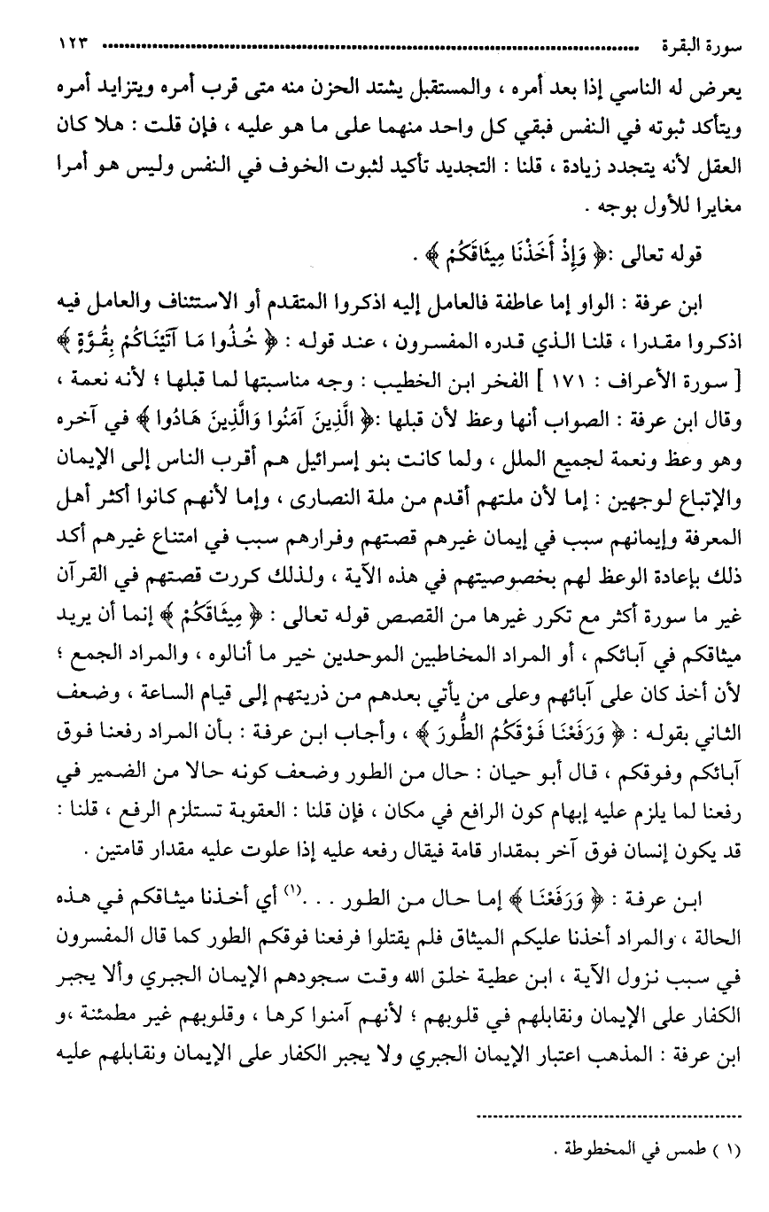 قال ابن عرفة: الواو إما عاطفة، والعامل فيه «اذْكُرُوا» المتقدم أو استئناف (والعامل فيه «اذكروا») مقدر. (والَّذي قرره المفسرون) عند قول الله عَزَّ وَجَلَّ ّ: {خُذُواْ مَآءَاتَيْنَاكُم بِقُوَّةٍ}. الآية.