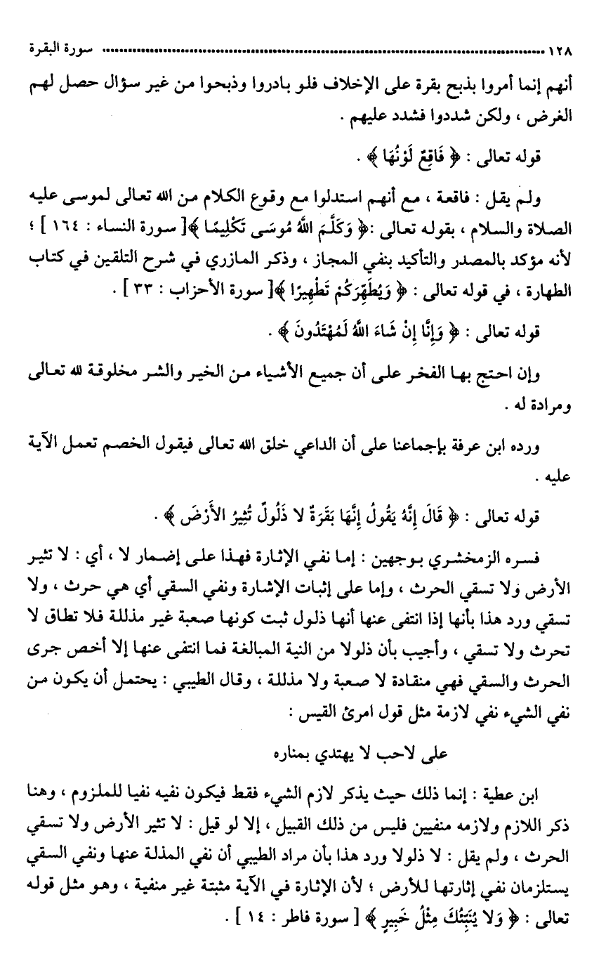 فسره الزمخشري بوجهين: إما نفي الإشارة فهو على إضمار «لاَ» أي لا تثير الأرض ولا تسقي الحرث، وإما على إثبات الإشارة ونفي السقي أي هي تحرث ولا تسقي. ورد هذا بأنها إذا انتفى عنها أنّها ذلول ثبت كونها صعبة غير مذللةٍ فلا تطاق لا إلى الحرث ولا إلى سقي. وأُجيب عنه بأن ذلولا من أبنية المبالغة فما انتفى عنها إلا الأخص