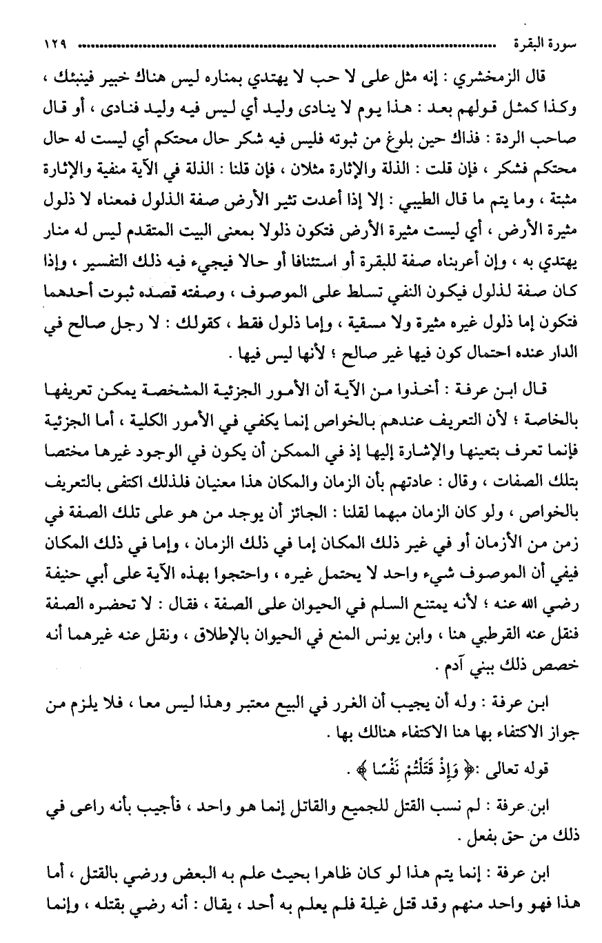 قال ابن عرفة: وأخذوا من الآية أن الأمور الجزئية المشخّصة يمكن تعريفها بالخاصة، لأن التعريف بالخواص إنما يكفي عندهم في الأمور الكلية، أما الجزئية فإنها تعرف بتعيينها والإشارة إليها، إذ في الممكن أن يكون في الوجود غيرها مختصا بتلك الصفات.