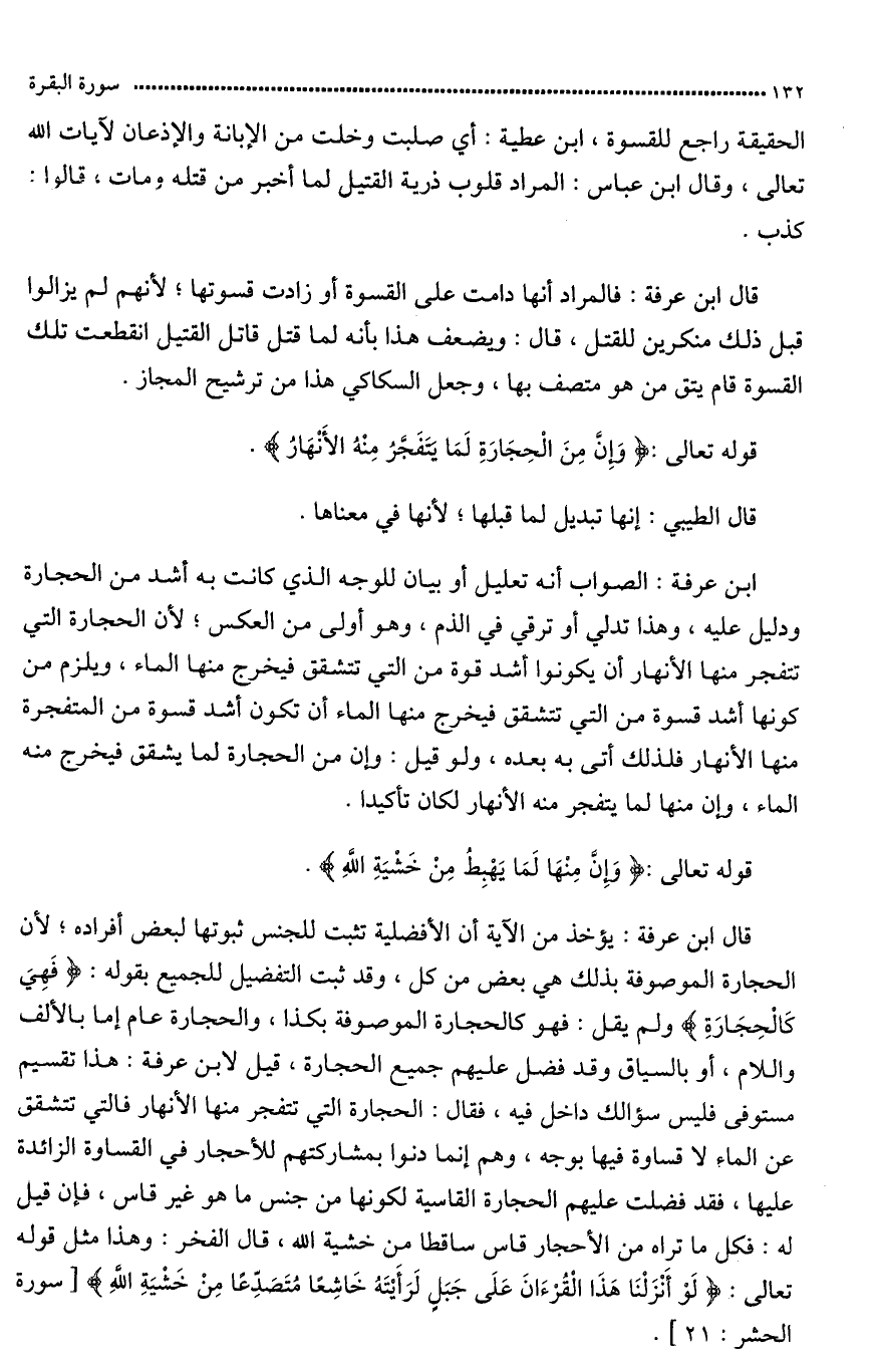 قال ابن عرفة: الصواب أنها تعليل أو بيان للوجه الّذي كانت به أشدّ من الحجارة ودليل عليه. وهذا تدلي أو ترقي الذّمّ وهو أولى من العكس لأن الحجارة التي تتفجر منها (الأنهار) أفضل وأعلى من الحجارة التي تنشق فيخرج منها الماء. ويلزم من كونها أشد قسوة من التي تنشق فيخرج منها الماء أن تكون أشد قسوة من المتفجرة عن الأنهار فلذلك أتى به بعده. ولو قيل: إن من الحجارة لما (ينشق) فيخرج (منها) الماء، وإن منها لما يتفجر منه الأنهار لكان تأكيدا. انتهى.