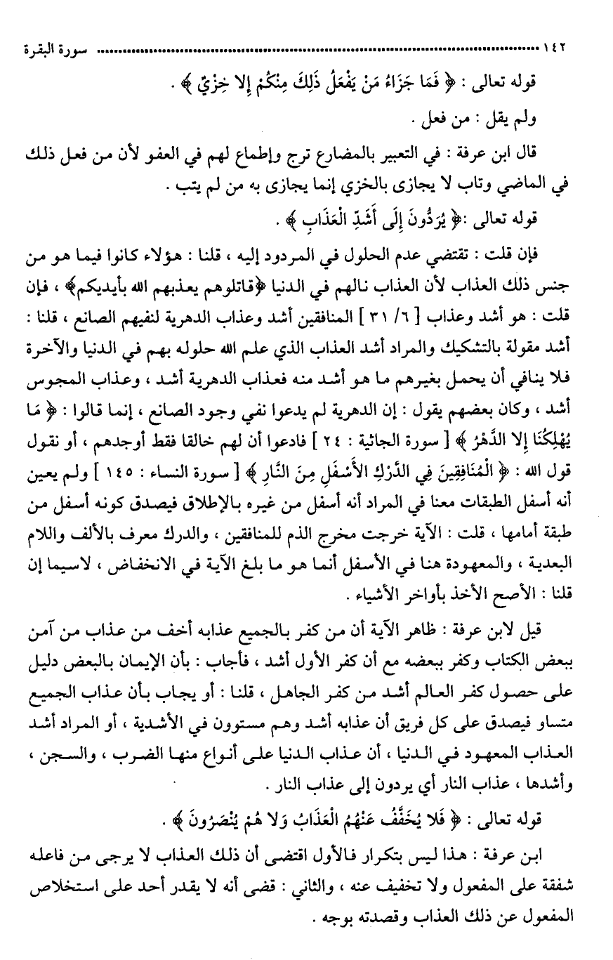 قيل لابن عرفة: ظاهر الآية أنّ من كفر بالجميع عذابه أخف من عذاب من آمن ببعض الكتاب وكفر ببعضه مع أن كفر الأول أشد؟