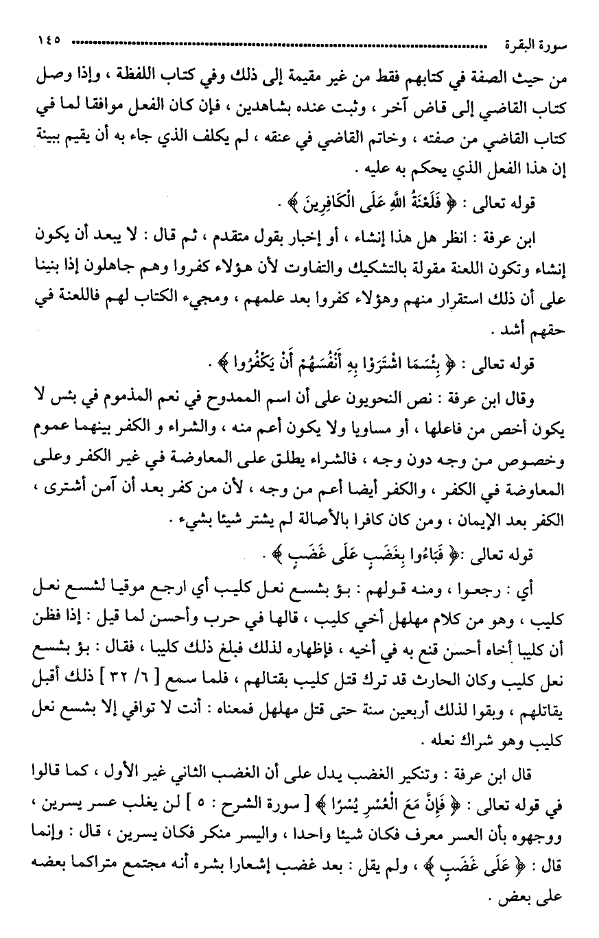 قال ابن عرفة: نص النحويون على أنّ (اسم) الممدوح في «نعم» أو المذموم في «بئس» لا يكون إلا أخص من فاعلها أو مساويا، ولا يكون أعمّ منه، والشراء والكفر بينهما عموم وخصوص من وجه، فالشّراء يطلق على المعارضة من غير الكفر وعلى المعارضة في الكفر، والكفر أيضا أعم من وجه، لأن من كفر بعد أن آمن اشترى الكفر (بالإيمان)، ومن كان كافرا بالإصالة لم يشتر شيئا بشيء.