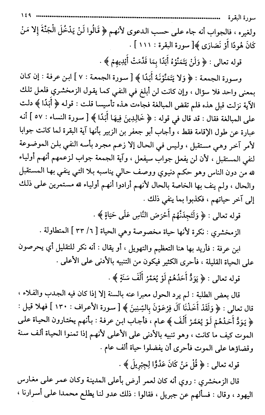 وفي سورة الجمعة {وَلاَ يَتَمَنَّوْنَهُ أَبَداً} - قال ابن عرفة؛ إن كانا بمعنى واحد فلا سؤال. وإن كانت «لَن» أبلغ في النفي كما يقول الزمخشري: فلعل تلك الآية نزلت قبل هذه، فلم تقتض المبالغة فجاءت هذه تأسيسا.
