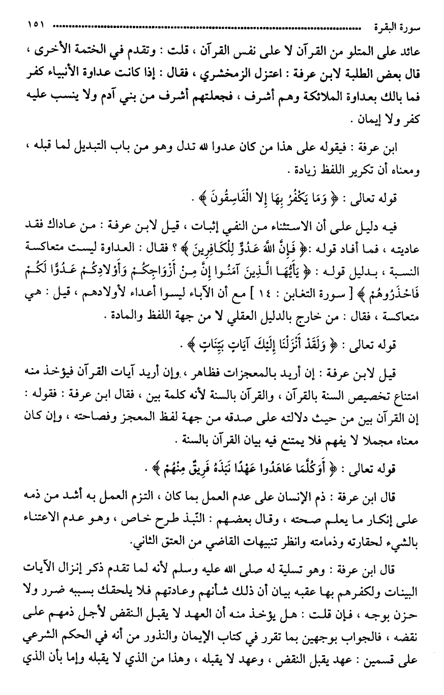 قيل لابن عرفة: من (عاداك) فقد عاديته فما أفاد قوله: {فَإِنَّ الله عَدُوٌّ لِّلْكَافِرِينَ} فقال (العداوة) ليست متعاكسة النسبة بدليل قول الله عَزَّ وَجَلَّ ّ} {ياأيها الذين ءامنوا إِنَّ مِنْ أَزْوَاجِكُمْ وَأَوْلاَدِكُمْ عَدُوّاً لَّكُمْ فاحذروهم} مع أن الآباء ليسوا أعداء لأولادهم.