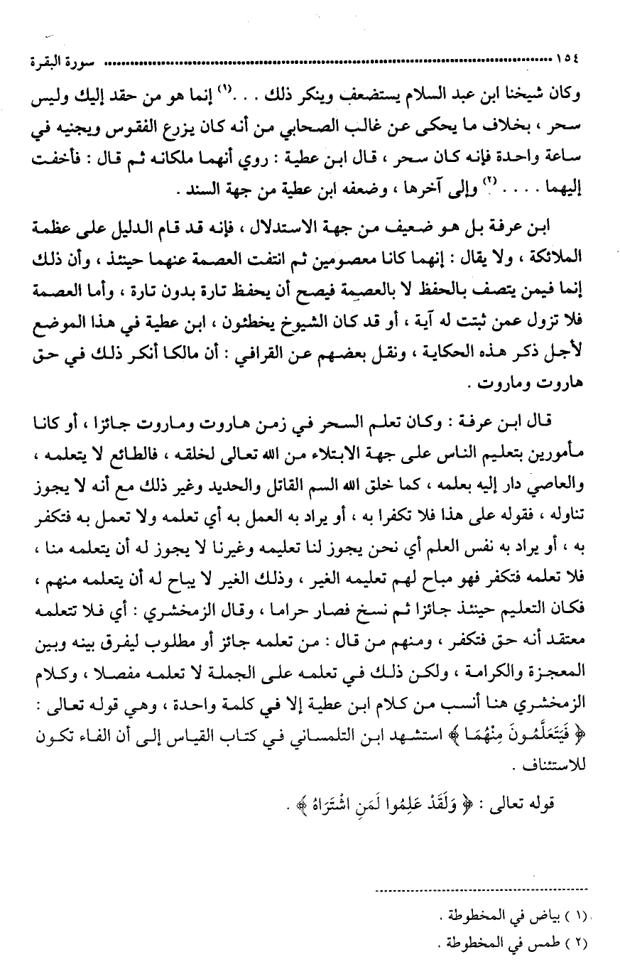 ومنهم من قال: إن تعلمه جائز أو مطلوب ليفرق بينه وبين المعجزة والكرامة، ولكن ذلك في تعلمه على الجملة لا تعلمه مفصلا، وكلام الزمخشري هنا أنسب من كلام ابن عطية إلا في كلمة واحدة. (وبقوله) تعالى: «فَيَتَعَلَّمُونَ مِنْهُمَا» استشهد ابن التلمساني في كتاب القياس على أن الفاء تكون للاستئناف.