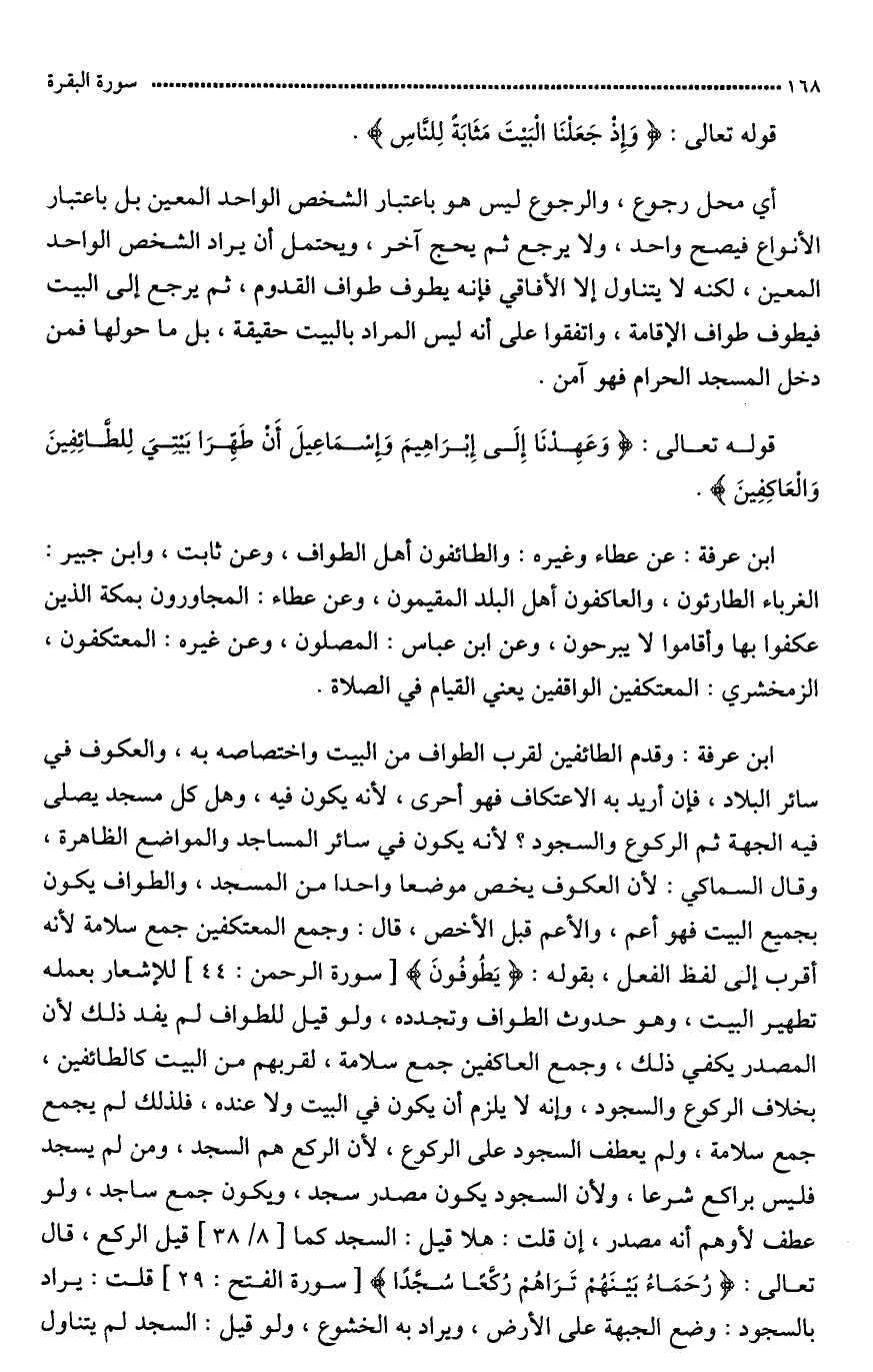 وقال السماكي: لأن العكوف يخص موضعا واحدا من المسجد والطواف يكون بجميع البيت فهو أعم والأعم قبل الأخص. قال وجمع: (الطائفين) جمع سلامة لأنه أقرب إلى لفظ بمنزلة يطوفون للاشعار بعلة تطهير البيت وهو حدوث الطواف وتجرده ولو قيل: الطواف: لم يفد ذلك لأن المصدر يخفي ذلك، وجمع العاكفين جمع سلامة لقربهم من البيت كالطائفين بخلاف الركوع والسجود فإنّه لا يلزم أن يكون في البيت ولا عنده، فلذلك لم يجمع جمع سلامة ولم يعطف (السجود على الركوع) لأنّ الرّكع هم السّاجدون ومن لم يسجد فليس براكع شرعا، ولأن السجود يكون مصدر «سَجَدَ» ويكون جمع «سَاجِد» ولو عطف لأوهم أنه مصدر.