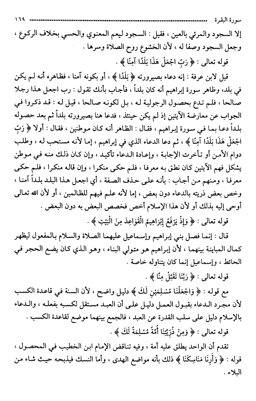 فقال: الظاهر أنه كان في موطنين فقال أولا: {رَبِّ اجعل هذا بَلَداًءَامِناً} ثم أعاد الدعاء في إبراهيم إما لأنه استجيب له وطلب دوام الأمن، أو تأخرت الإجابة وأعاد الدعاء تأكيدا، وإن كان ذلك منه في موطن (واحد) فيشكُل فهم الآيتين لأنه إن كان نطق به معرّفا فلِمَ حكى منكّرا، وإن قاله منكّرا فلِمَ حكي معرّفا؟ ومنهم من أجاب بانه على حذف الصفة أي اجعل هذا البلد آمنا، وخص بعض ذريته بالدعاء دون بعض إما لأنه علم أن (فيهم) الظالمين أو لأن الله أوحى إليه بذلك أو لأن هذا اسلام أخص فخصص البعض (به دون البعض).