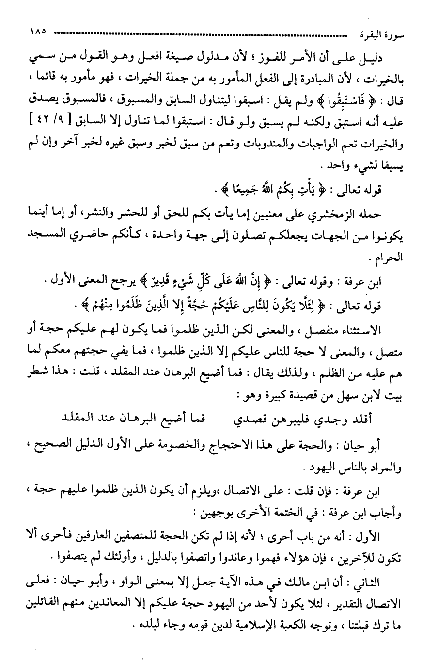 قال ابو حيان: فعلى الاتصال التقدير: لئلا يكون لأحد من اليهود حجة عليكم إلا المعاندين منهم القائلين: ما ترك قبلتنا وتوجه (للكعبة) إلا ميلا منه لدين قومه وحبا لبلده.