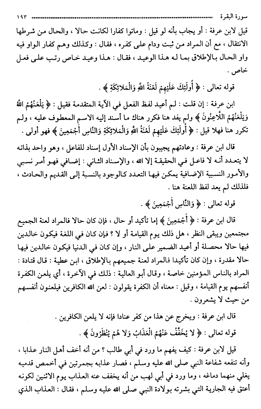 قال ابن عرفة: ويخرج عن هذا من كفر عنادا فإنه لا يلعن الكافرين.