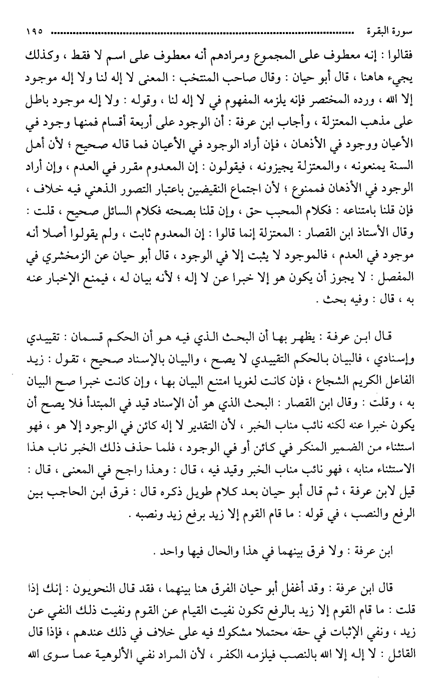 قال ابن عرفة: وقد أغفل أبو حيان الفرق بينهما فقد) قال النحويون: إنك إذا قلت: ما قام القوم إلا زيد بالرفع يكون نفيت القيام عن القوم وأثبته لزيد.