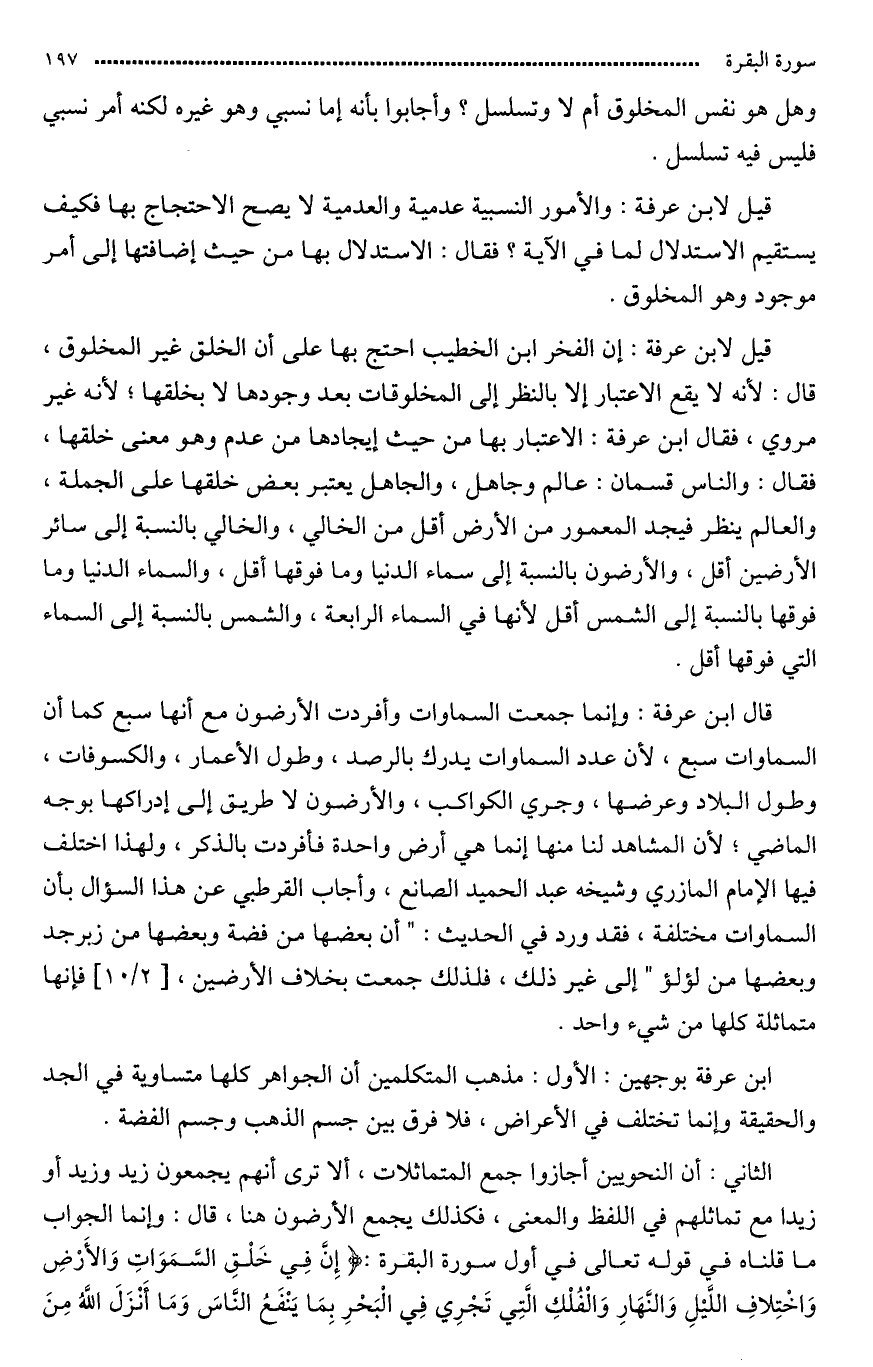 قيل لابن عرفة: إن الفخر ابن الخطيب احتج بها على أن الخلق غير المخلوق. قال: لأنه لا يقع الاعتبار إلا بالنظر إلى المخلوقات بعد وجودها لا بخلقها لأنه غير مرئي.