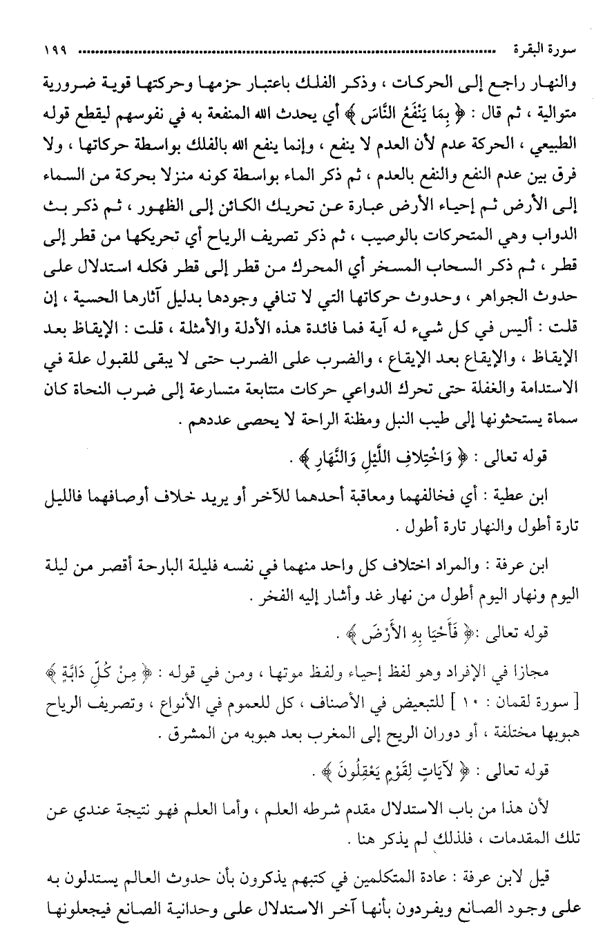 أي يحدث الله المنفعة به في نفوسهم (فيقطع) قول الطبيعي: «الحركة عدم» لأن المعدوم لا ينفع وإنما ينفع الله بالفلك بواسطة حركاتها ولا فرق بين عدم النفع والنفع بالعدم. ثم ذكر (الماء) بواسطة كونه (منزلا بحركة) من السماء والأرض ثم ذكر أنه بث الأحياء بواسطة تلك الحركة، وكيف يكون العدم واسطة في الإحياء ثم إحياء الأرض عبارة عن تحريك الحب الكائن فيها إلى الظهور، ثم ذكر بث الدواب وهي المتحركات بالوصيب ثم ذكر تصريف الرياح أي تحريكها من قطر إلى قطر (ثم ذكر السحاب المسخر أي المحرك من قطر إلى قطر وكله) استدلال على حدوث الجواهر وحدوث حركاتها التي لا (تنافي) وجودها بدليل إثارتها الحسية.