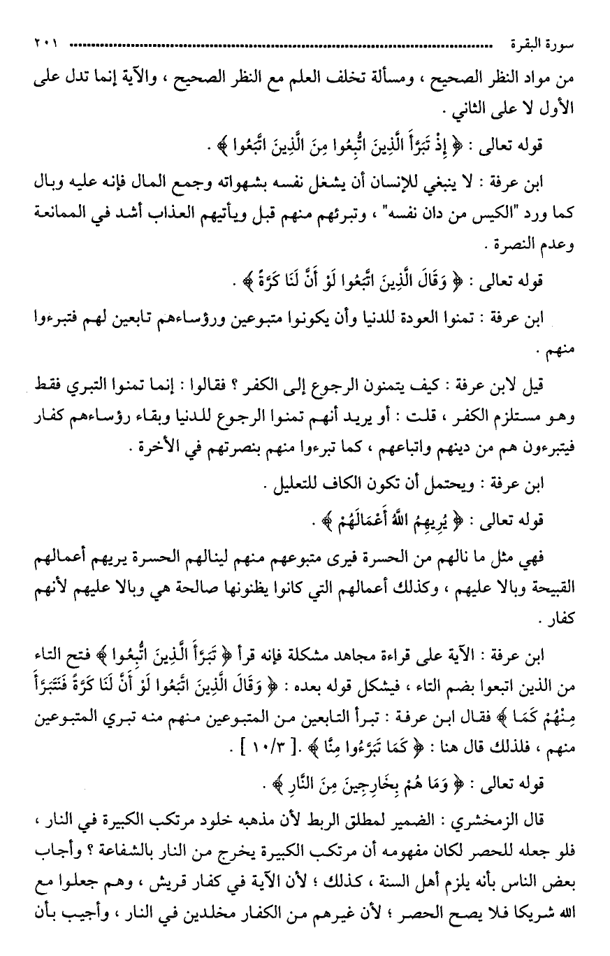 قيل لابن عرفة: الآية على قراءة مجاهد مشكلة فإنه قرأ «إذ (تبرأ) الذين اتَّبَعُوا» بفتح التاء «منَ الّذين اتُّبِعُوا» (بضم التاء) فيشكل قوله {وَقَالَ الذين اتبعوا لَوْ أَنَّ لَنَا كَرَّةً فَنَتَبَرَّأَ مِنْهُمْ} (لأنهم قد تبرؤوا منهم)؟