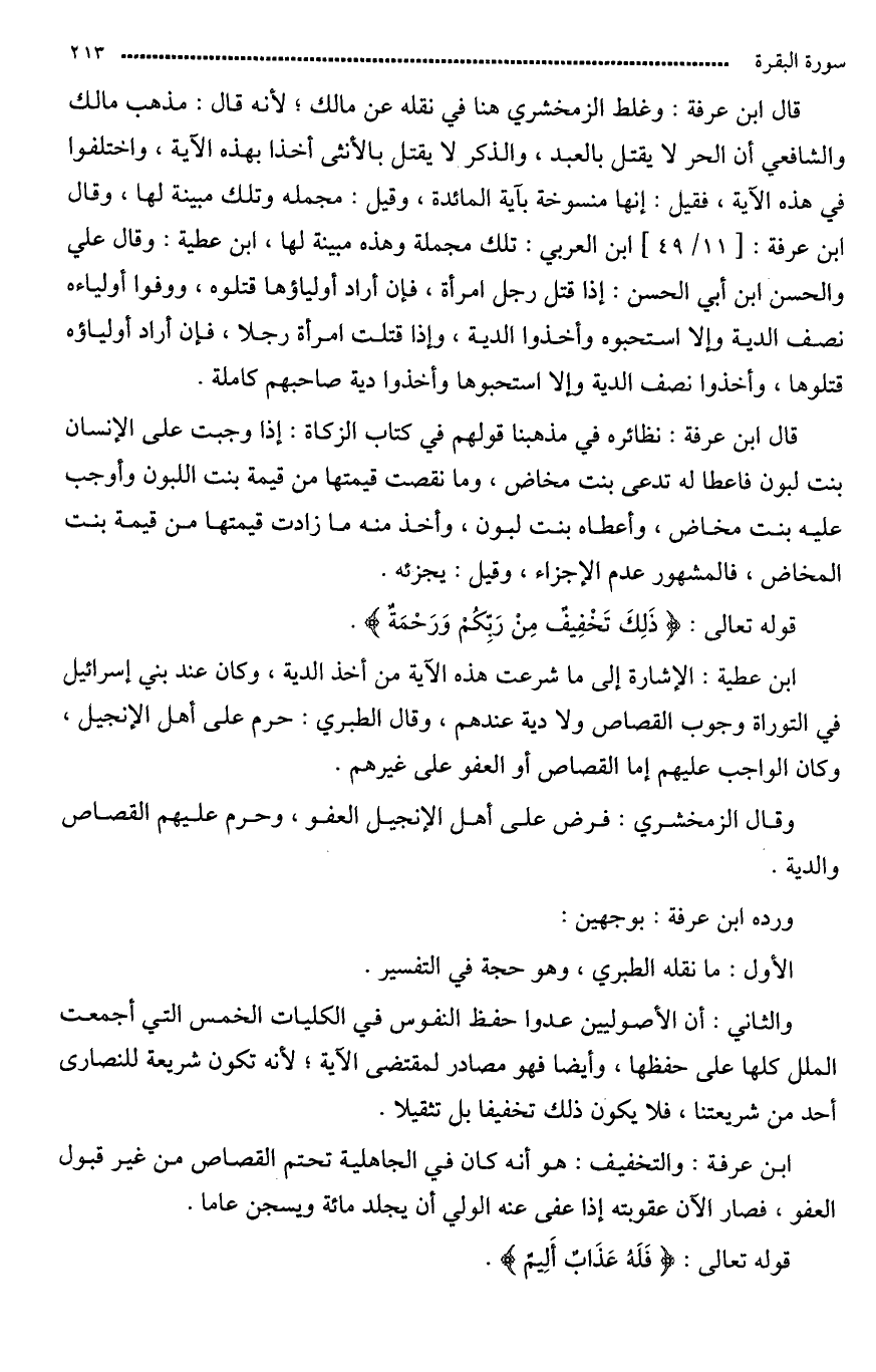 قال ابن عرفة: فالتخفيف هو أنه كان في الجاهلية تحتم القصاص من غير قبول العفو، فصار الآن عقوبته إذا عفى عنه الولي أن يجلد مائة ويسجن عاما.
