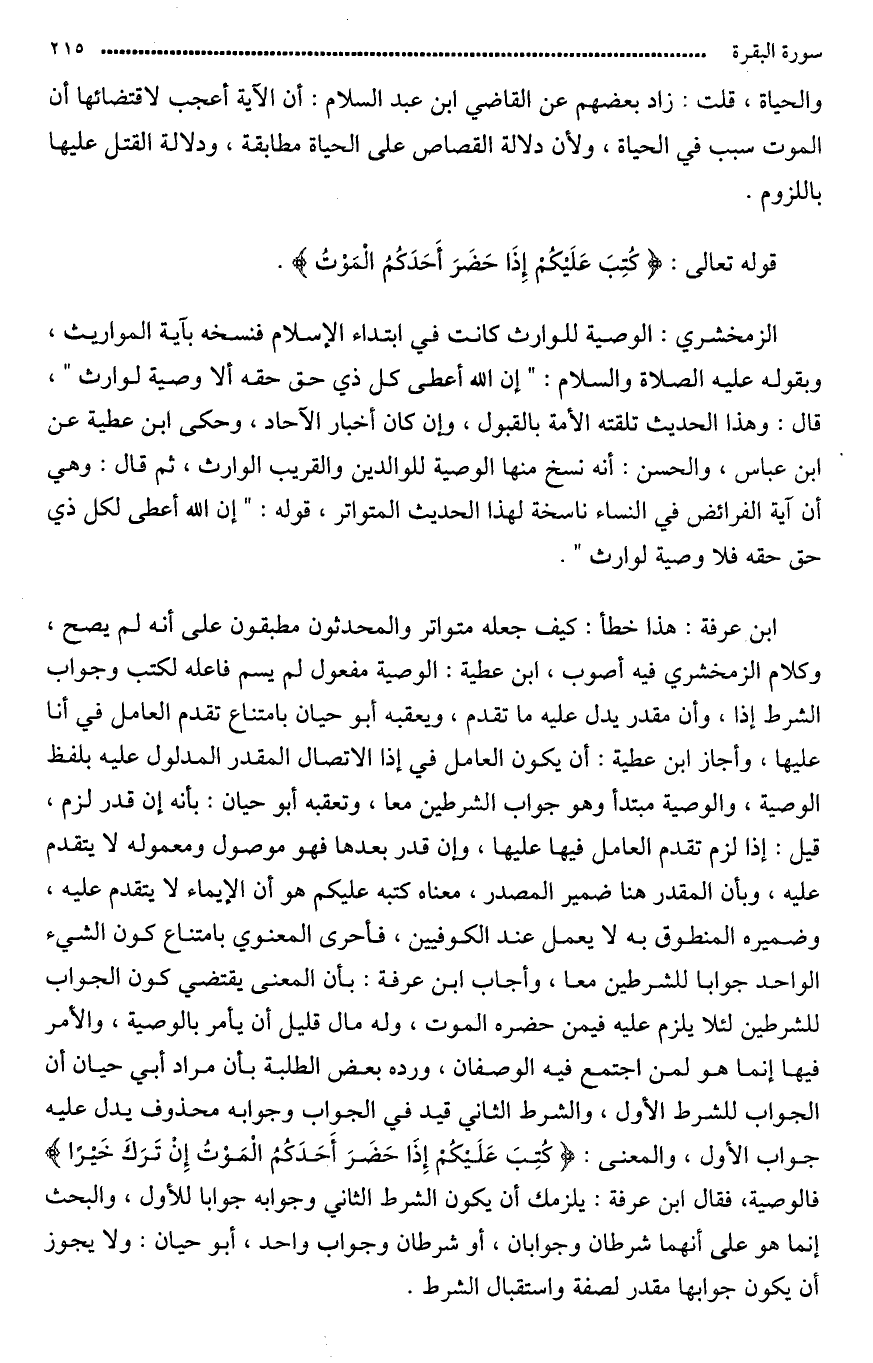 قال (ابن عرفة): (وهذا حديث تلقته الأيمة بالقبول حتى لحق بالمتواتر وإن كان أخبار آحاد. وحكى ابن عطية عن ابن عباس والحسن أنه نسخ منها الوصية للوالدين والقريب والوارث ثم قال: وهي في آية الفرائض في النساء) (ناسخة لهذا الحديث المتواتر: قوله: «إن الله أعطى كل ذي حق حقه»). وهذا خطأ كيف يجعله متواترا والمحدثون مطبقون على أنه لم يصح، وكلام الزمخشري فيه أصوب.