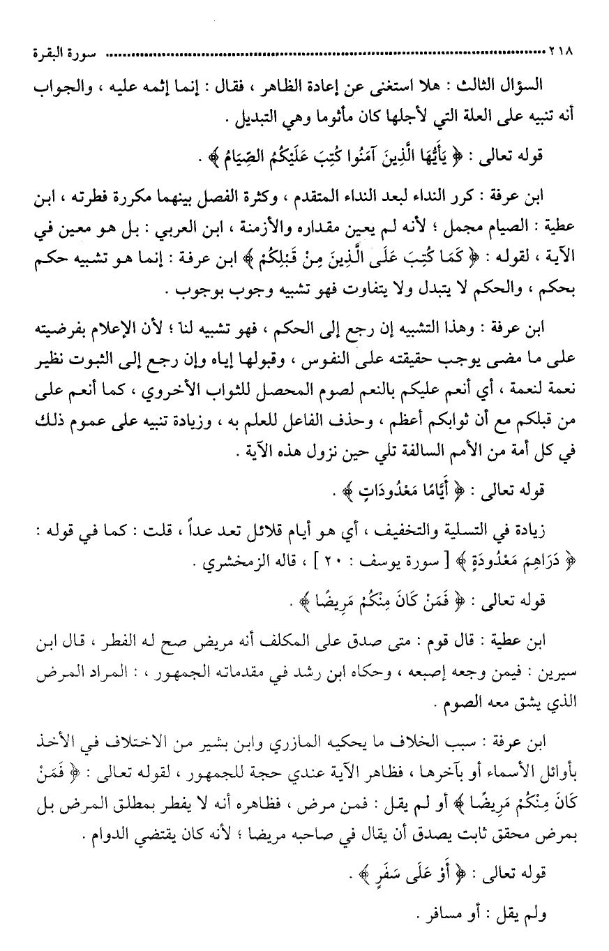 قال ابن عرفة: سبب الخلاف ما يحكيه المازري وابن بشير من الاختلاف في الأخذ بأوائل الأسماء أو بأواخرها فظاهر الآية عندي حجة للجمهور لقول الله {فَمَن كَانَ مِنكُم مَّرِيضاً} ولم يقل: فمن مرض فظاهره، أنه لا يفطر بمطلق المرض بل مرض محقق ثابت يصدق أن يقال في صاحبه كان مريضا لأن «كان» تقتضي الدوام.