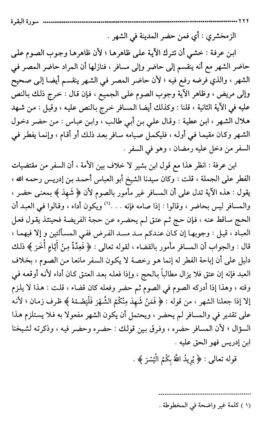 قال ابن عرفة: خشي أن يترك الآية على ظاهرها لأن ظاهرها وجوب الصوم على حاضر الشهر مع أنه ينقسم إلى حضري وإلى مسافر (فتأولها) على أن المراد حاضر المصر في الشهر والّذي فر منه وقع فيه، لأن حاضر المصر في الشهر ينقسم (أيضا) إلى صحيح وإلى مريض، وظاهر الآية وجوب الصوم على الجميع فإن قال: خرج ذلك بالنّص عليه في الآية الثانية. قلنا: وكذلك المسافر خرج بالنّص عليه. وقيل: من شهد هلال الشهر.
