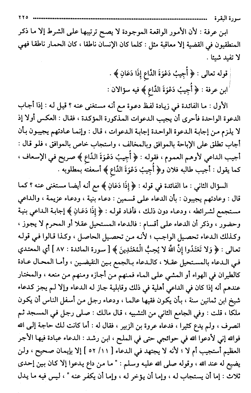 قال ابن عرفة: وعادتهم يجيبون بأنّ الدّعاء على قسمين دعاء بنية وعزيمة، والداعي مستجمع لشرائطه، ودعاء دون ذلك، فأفاد قوله «إِذَا دَعَانِ» إجابة الداعي بنية وحضور. وذكروا أنّ الدّعاء على أقسام فالمستحيل عقلا والمحرم لا يجوز، وكذلك الدعاء بتحصيل الواجب لأنه من تحصيل الحاصل، وكذا قالوا في قوله تعالى {وَلاَ تعتدوا إِنَّ الله لاَ يُحِبُّ المعتدين} أي المعتدي في الدعاء بالمستحيل عقلا كالدعاء بالجمع بين النقيضين وأما المحال في/ العادة كالطيران في الهواء والمشي على الماء فمنهم من أجازه ومنهم من منعه.