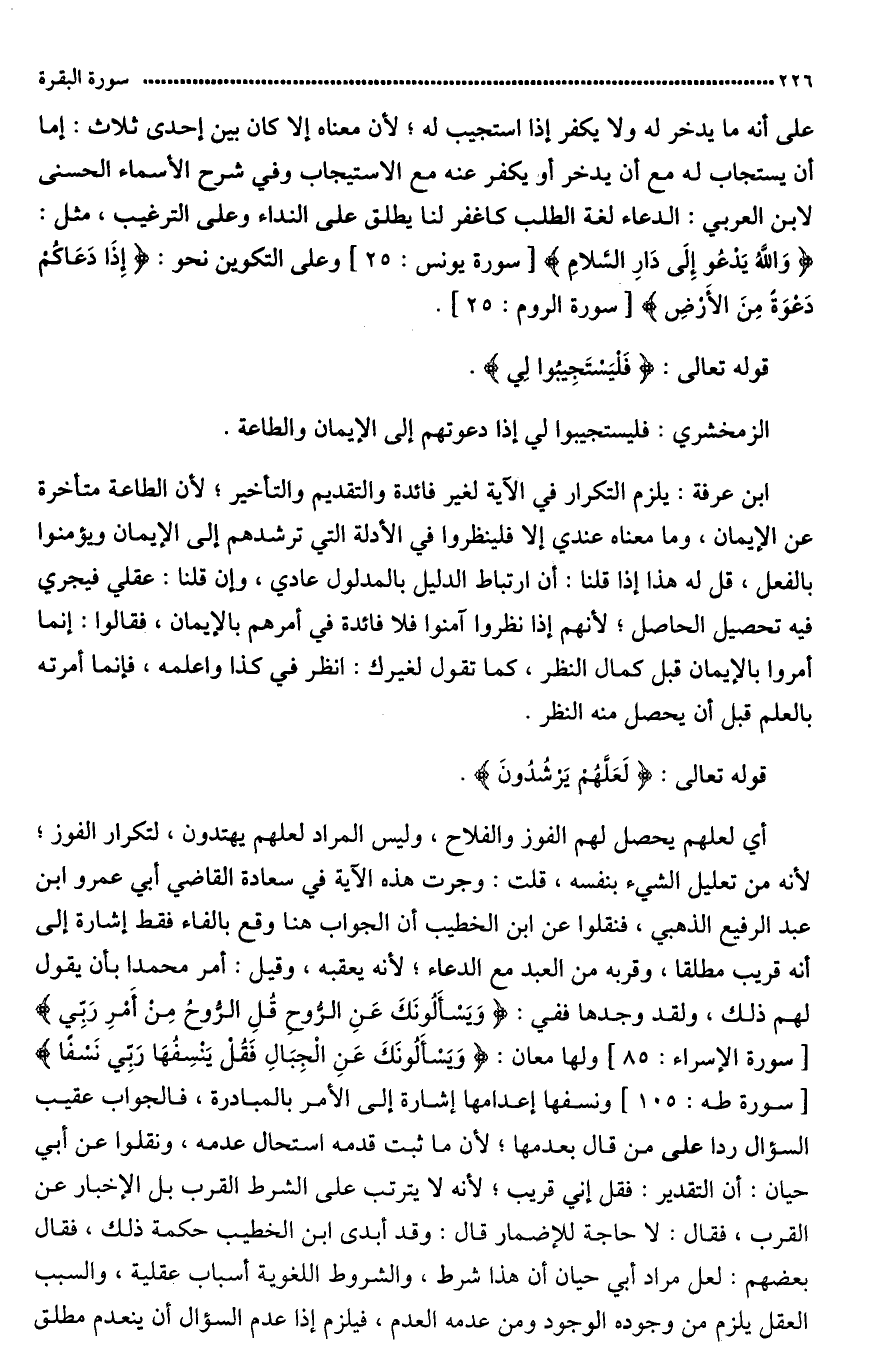 قلت: وجدت هذه الآية في ميعاد القاضي أبي علي عمر بن عبد الرفيع فنقلوا عن ابن الخطيب أن الجواب (هنا): وقع بالفاء فقط إشارة إلى أنه قريب مطلقا وقربه من العبد مع الدعاء لا يعقبه، وقيل: أمر محمد صَلَّى اللَّهُ عَلَيْهِ وَسَلَّم َ بأن يقول لهم ذلك (وب «قل» وحدها) في {وَيَسْئَلُونَكَ عَنِ الروح قُلِ الروح مِنْ أَمْرِ رَبِّي} (وبهما) معا في {وَيَسْئَلُونَكَ عَنِ الجبال فَقُلْ يَنسِفُهَا رَبِّي نَسْفاً} الآية، ونسفها إعدامها إشارة إلى الأمر بالمبادرة بالجواب عقب السؤال ردا على من قال بقدمها لأن ما ثبت قدمه استحال عدمه. ونقلوا عن أبي حيان أنّ التقدير «فَقُلْ إنِي قَرِبٌ» لأنه لا يترتب على الشرط القرب بل الإخبار عن القرب، فقال الحسّاني: لا حاجة إلى إضمار «قُلْ» وقد أبدى ابن الخطيب حكمه ذلك.