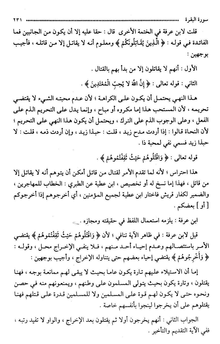 قلت لابن عرفة في الختمة الأخرى: قاتل مفاعلة لا يكون إلا من الجانبين فما الفائدة في قوله «الذين يُقَاتِلُونَكُمْ» ومعلوم أنّه لا يقاتل إلاّ من قتله؟