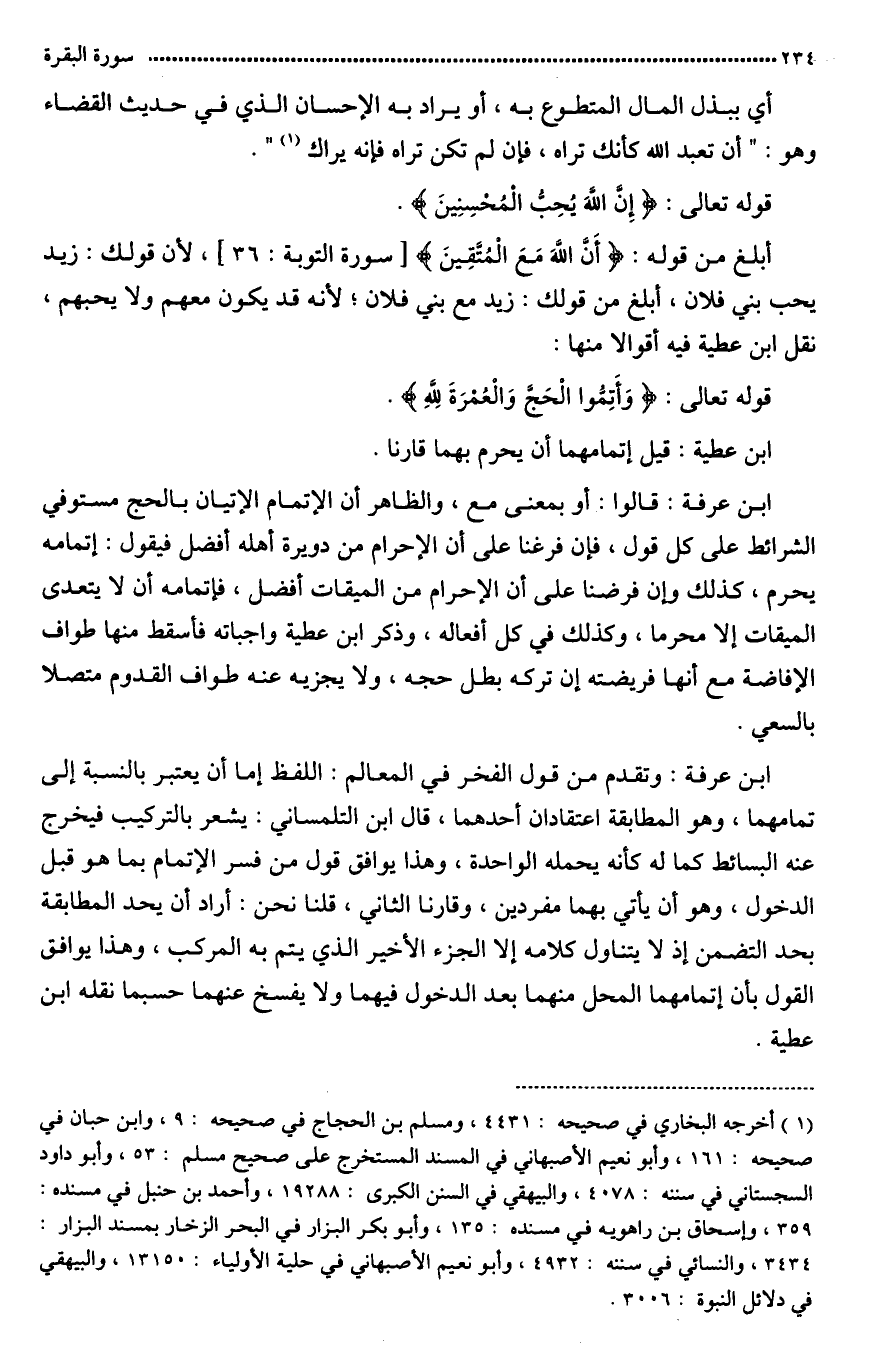 قال ابن عرفة: فالواو بمعنى «مع» والظاهر أن الإتمام الإتيان بالحج مستوفى الشرائط على كل قول. فإن فرعنا على أنّ الإحرام من الميقات أفضل فإتمامه أن لا يتعدى الميقات إلا محرما وكذلك في كل أفعاله.