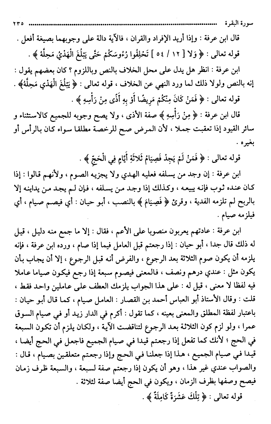 قلت: وقال الأستاذ أبو العباس أحمد بن القصار: (العامل) / «صيام»، كما قال أبو حيان باعتبار لفظ المطلق والمعنى يبنه كما تقول: أكرم في الدار زيدا. أو في السوق عمرا أو لو لزم كون الثلاثة بعد الرجوع لتناقضت الآية ولكان يلزم أن يكون السبعة في الحج لأنه كما (تجعل) إذا رجعتم قيدا في صيام الجميع فاجعل «في الحج» أيضا قيدا في صيام الجميع. هذا إذا جعلنا «في الحَجّ» و «إِذَا رَجَعْتُمْ» متعلقين ب «صيام».