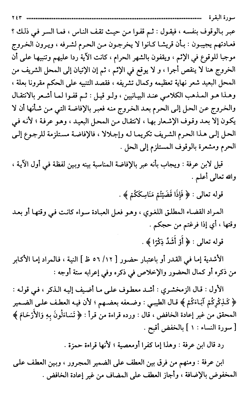 قال: وعادتهم يجيبون عن ذلك بأنّ قريشا كانوا لا يخرجون من الحرم لشرفه ويرون الخروج عنه موجبا للوقوع في الإثم، (ويقفون بالمشعر الحرام، فأتت الآية ردا عليهم وتنبيها على أن الخروج هنا لاينقص أجرا ولا يوقع في الإثم) ثم إنّ الإتيان إلى المحل الشريف من